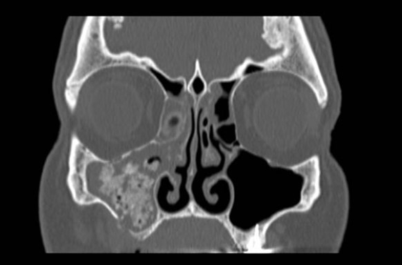 In Figure 2 the maxillary sinus is opaque (infected) due to chronic sinusitis before surgery. This resulted in infection of the zygoma implant and the patient presented with pus discharging through the skin over the zygoma area. The zygoma implant is described as running between the sinus bone and its mucosa, however when this area is infected, a drainage route is created when the bone is perforated and the sinus mucosa is infected and fragile. In this case the infection was drained by FESS and once sinus ventilation was re-established, the infection settled and we managed to preserve the zygoma implant.