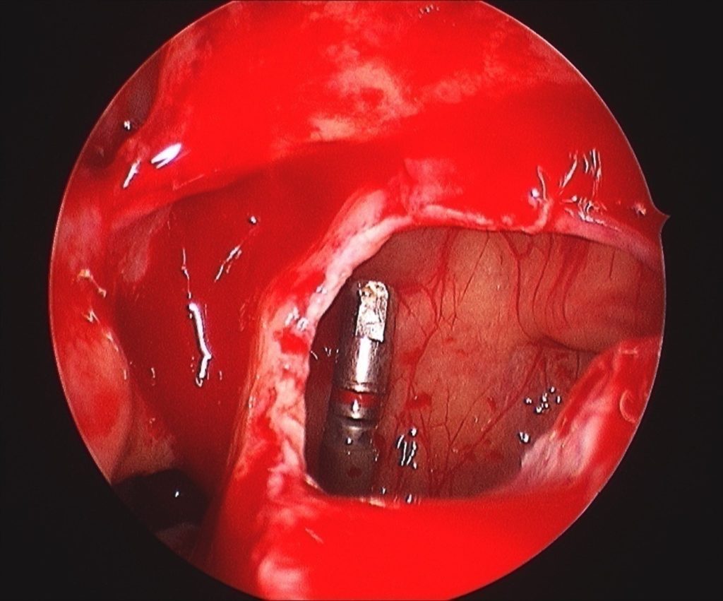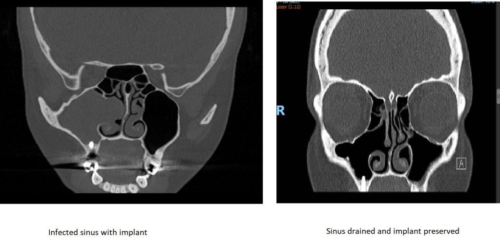 Figure 3 is a good example of implant preservation. This patient presented with psudomonas infection of the right maxillary sinus endangering the viability of the dental implant. The infection was drained by FESS and a few months later the patient had a repeat scan which showed complete resolution of the infection, ventilation of the maxillary sinus and the implant intact and secure.